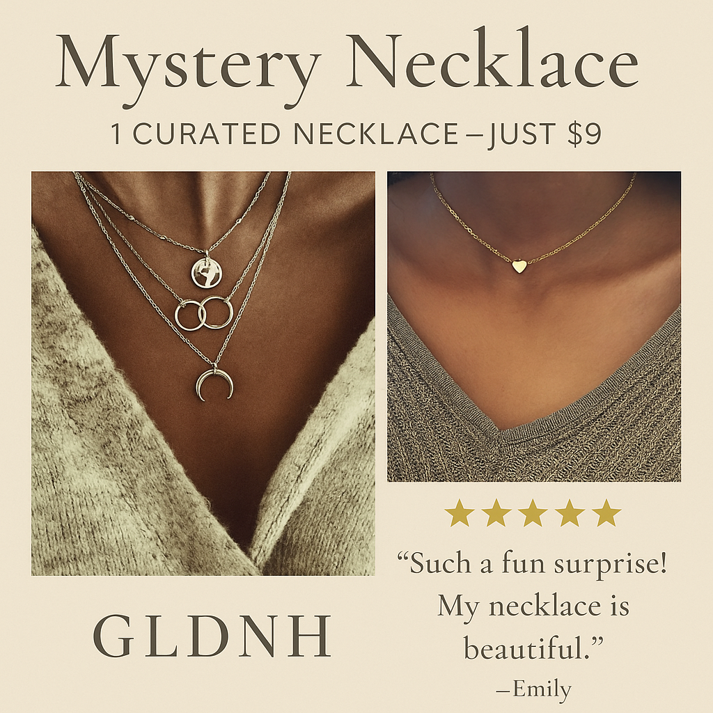 Each necklace is chosen to feel meaningful and stylish — a treasure you’ll actually want to wear. You won’t know exactly which one you’ll receive, but you can expect a design that feels special, soulful, and a little bit golden.